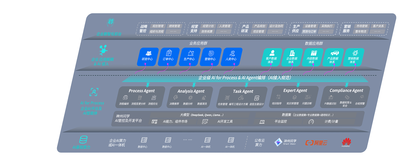 端到端的一站式AI工作空间深度融合了从企业战略规划到日常经营的全流程业务板块,,,,定向解决车企内部领域多、、部门多、、、、链条长、、、场景碎片化等难题,,,支持车企快速构建以AI为核心的生产力写作体系,,实现任务执行与AI能力的无缝集成与交互